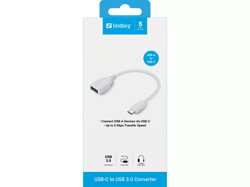 O Adaptador USB-C para USB 3.0 Sandberg resolve um problema prático e comum: ter um portátil ou dispositivo moderno com porta USB-C e precisar de ligar um periférico ou acessório com conector USB-A, o standard anterior que ainda equipa a grande maioria dos discos externos, impressoras, ratos, teclados, dongles e outros acessórios em uso activo. Com 10 cm de cabo flexível entre o conector USB-C macho e a porta USB-A fêmea, o adaptador é suficientemente curto para não criar volume ou excesso de cabo na secretária, mas suficientemente comprido para ligar o periférico sem forçar o ângulo do conector. A instalação é plug-and-play em Windows XP, Vista, 7, 8, 10 e 11 e em macOS, sem necessidade de instalar drivers ou software adicional — basta ligar o adaptador à porta USB-C e conectar o periférico USB-A à porta do adaptador.