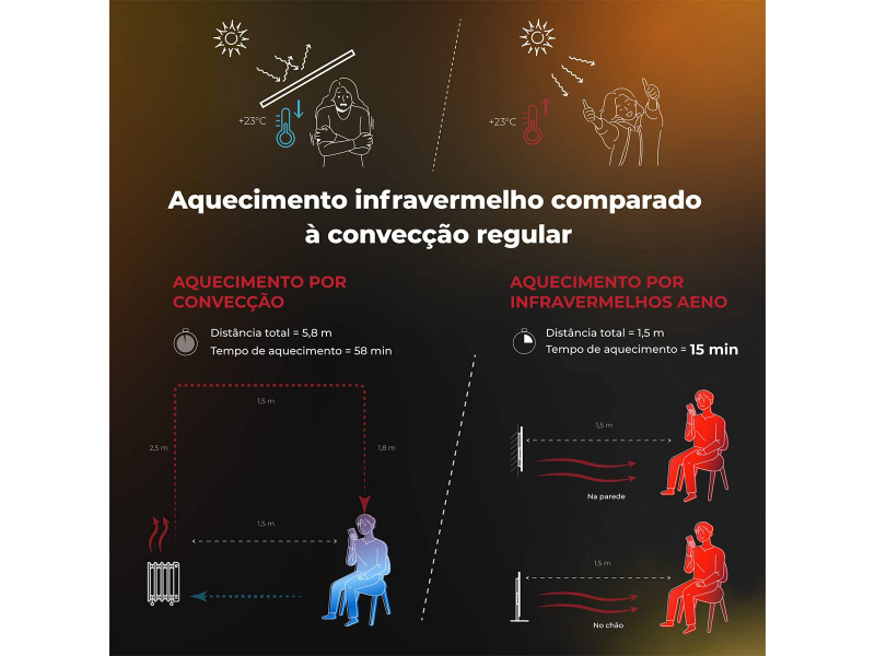 • Tecnologia Infravermelha: Aquecimento eficiente que aquece objetos e o ambiente, sem ressecar o ar ou produzir sopros de ar desconfortáveis.