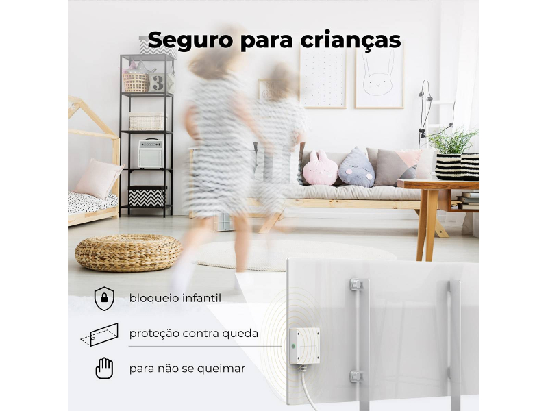 • Segurança: Inclui proteção contra super aquecimento e um sensor de queda que desliga o aquecedor automaticamente caso caia, além de bloqueio para crianças no aplicativo.