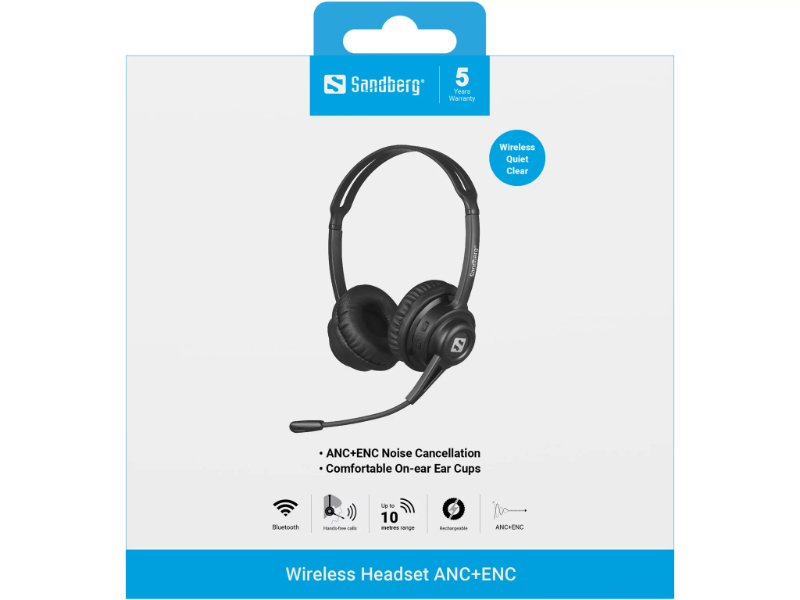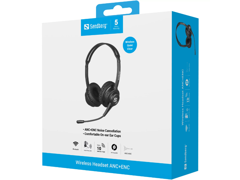> O Sandberg Wireless Headset ANC+ENC é um avançado conjunto de auscultadores sem fios. A função ANC embutida (Cancelamento de Ruído Ativo) garante um som excelente e sem perturbações, independentemente se estiver num escritório ruidoso ou com ruído de fundo constante (como num avião ou comboio).