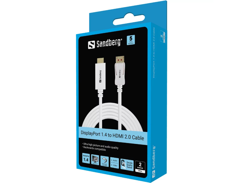 O Cabo Sandberg DisplayPort 1.4 para HDMI oferece uma solução elegante e fiável para ligar equipamentos modernos com qualidade de imagem 4K. Com dois metros de comprimento e acabamento branco, foi concebido para proporcionar uma transmissão estável de vídeo e áudio entre computadores, gráficas e monitores ou televisores compatíveis.