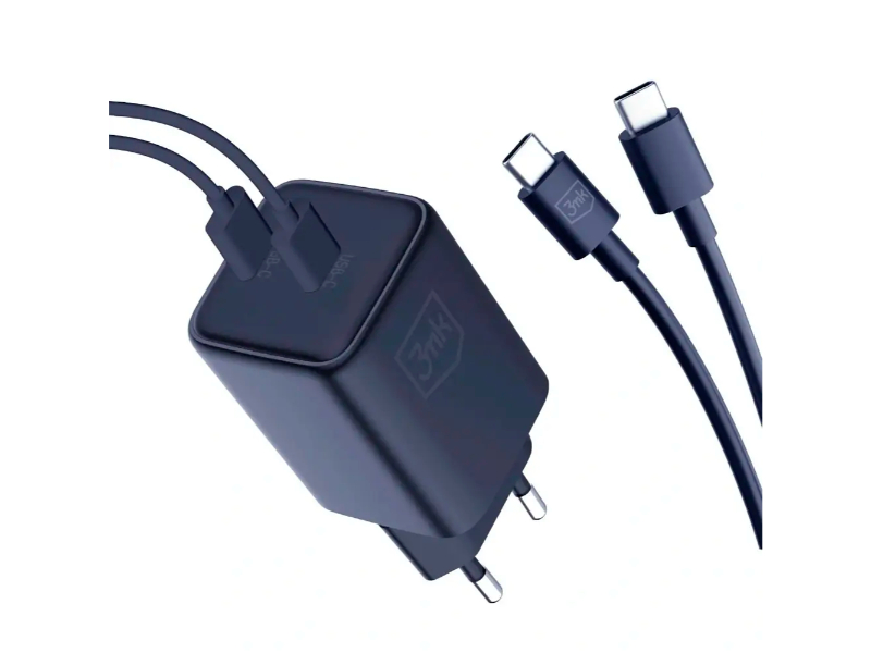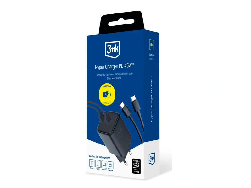 O carregador 3MK Hyper Charger PD de 45W, na cor preta, é projetado para um carregamento rápido e eficiente. Vem com um cabo USB-C para USB-C, garantindo uma conexão estável e de alta velocidade. Ideal para dispositivos que suportam Power Delivery, oferece potência e praticidade para carregar vários dispositivos de forma rápida.