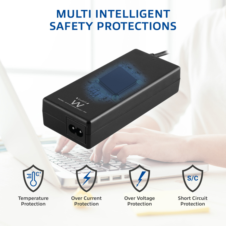 Nenhuma concessão foi feita para segurança. O adaptador possui um sistema de proteção inteligente quádruplo, que protege contra superaquecimento, sobretensão, sobrecorrente e curto-circuito. Além disso, a placa de carregamento parará de carregar quando perceber que a bateria está cheia.