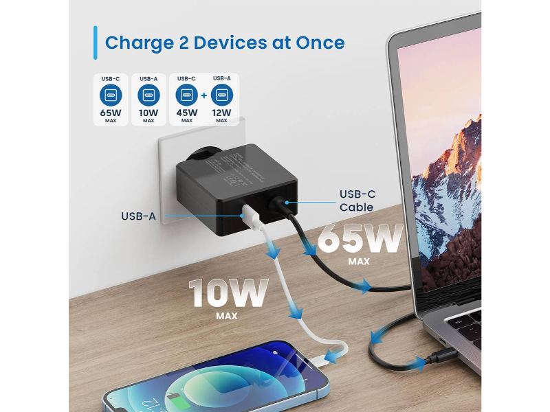Saída USB-C + USB-A: 45W + 12W (57W máx.)