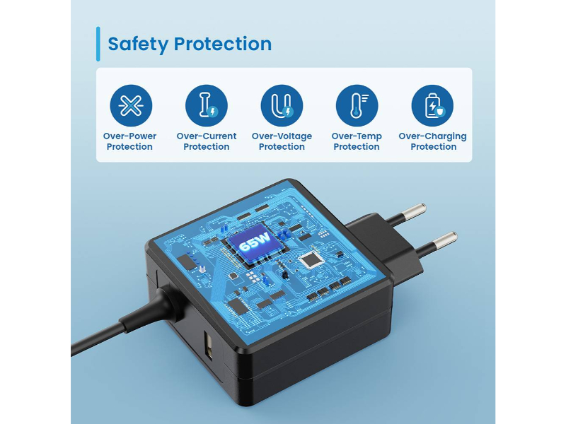 O carregador está equipado com um sistema de proteção quádrupla que protege contra sobreaquecimento, sobretensão, sobrecorrente e curto-circuitos. Além disso, o carregador USB tipo C pára de carregar quando se apercebe de que a bateria está cheia.