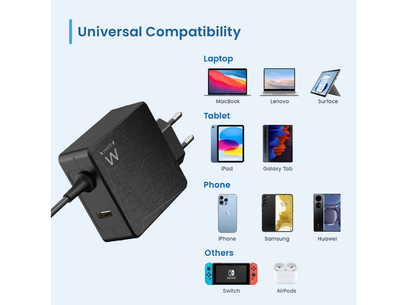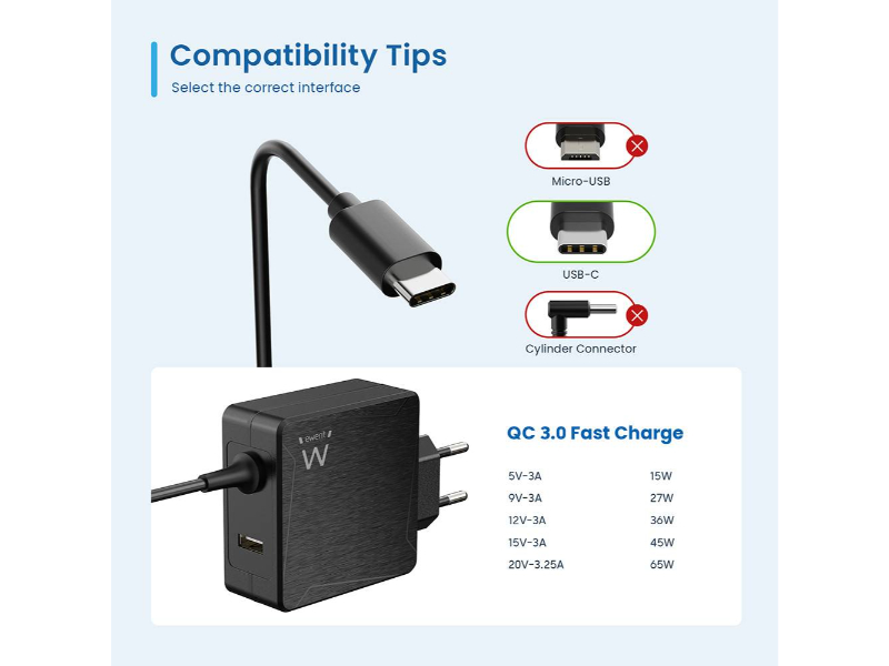 O carregador EW3978 USB Type-C 65W é o companheiro perfeito para vários dispositivos, incluindo computadores portáteis, smartphones, tablets com porta de carregamento USB Type-C e também com porta USB-A adicional. O computador portátil é sempre carregado com a quantidade correcta de eletricidade graças aos perfis PD (Power Delivery) predefinidos. O carregador comunica com o computador portátil e negoceia o perfil de carregamento mais eficaz. Tem um smartphone/tablet com conetor USB tipo C? O EW3978 também carrega smartphones/tablets.