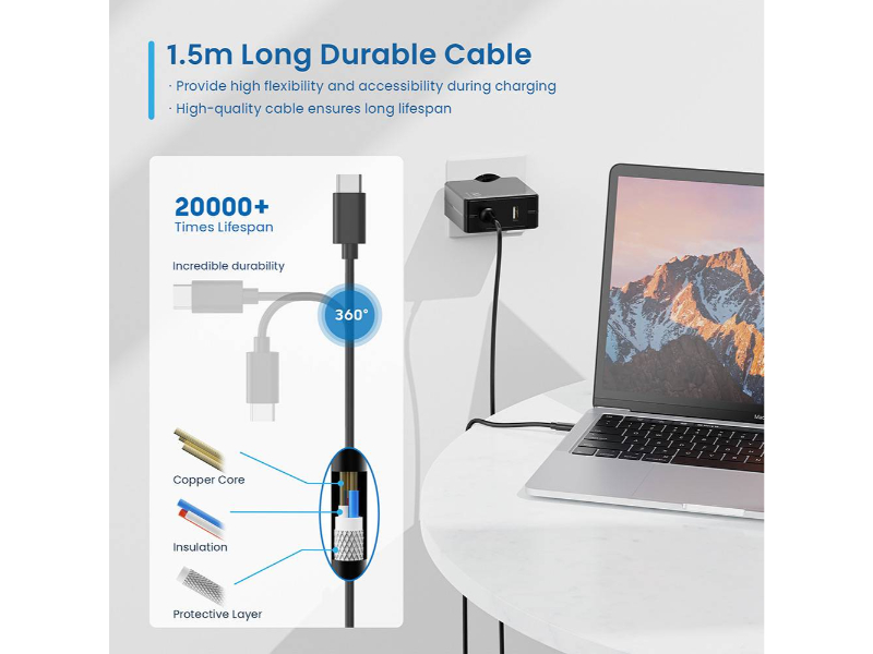 Cabo USB-C extra longo de 150 cm, facilitando o acesso a tomadas menos acessíveis.