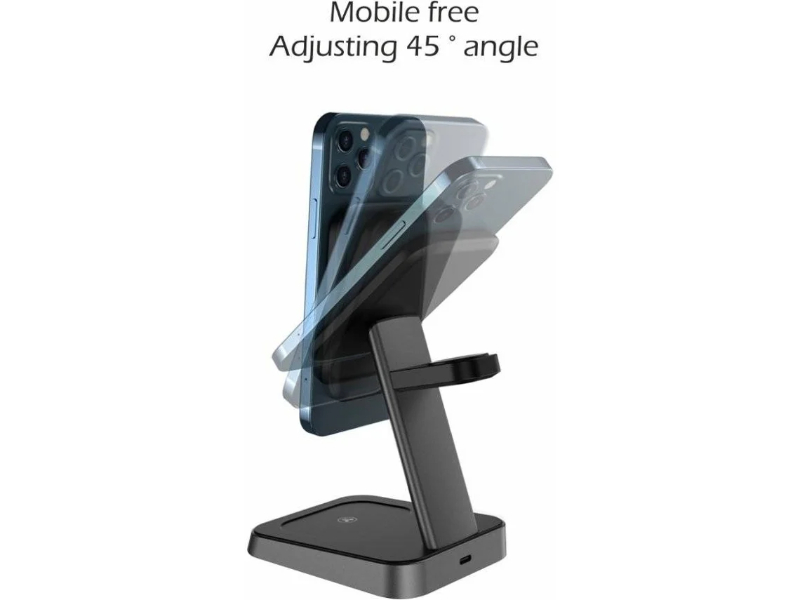 Stand e carregador triplo wireless Qi, com aderência MagSafe para telemóveis (5W a 15W), e zonas específicas para AirPods (5W) e Apple Watch (2.5W), no total de 22.5W.