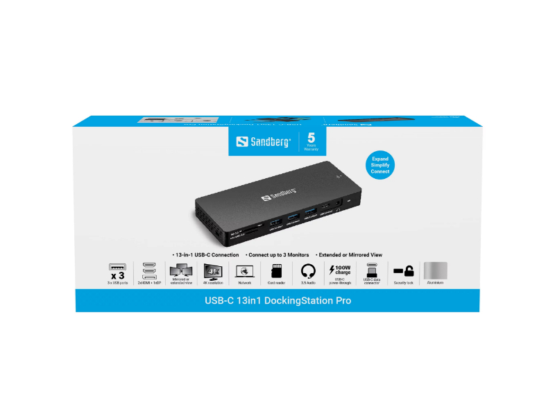 A TodayTech.eu foi directa na sua avaliação: graças à variedade de portas, alta velocidade de transferência e qualidade de construção, a Sandberg USB-C 13in1 DockingStation Pro está entre as melhores docking stations universais do mercado. A eReviews.dk destacou precisamente a variedade de tipos de porta como o argumento mais relevante — USB para dados, RJ45 para internet, dois tipos de leitor de cartões — que permite usar o computador de formas completamente diferentes a partir de um único cabo USB-C. A Komputer for Alle confirmou múltiplas ligações com altas velocidades de transferência via USB. Com 2x HDMI 2.0, 1x DP 1.4, suporte a 3 monitores simultâneos a 4K@60Hz, 3x USB 3.0 até 10Gbps, 1x USB-C 3.1, RJ45 Gigabit, USB-C PD 100W pass-through, leitor SD/SDHC/SDXC/MMC, leitor MicroSD, saída de áudio minijack e fecho de segurança, a 13in1 Pro transforma qualquer laptop com USB-C DP Alt Mode num posto de trabalho completo em segundos.