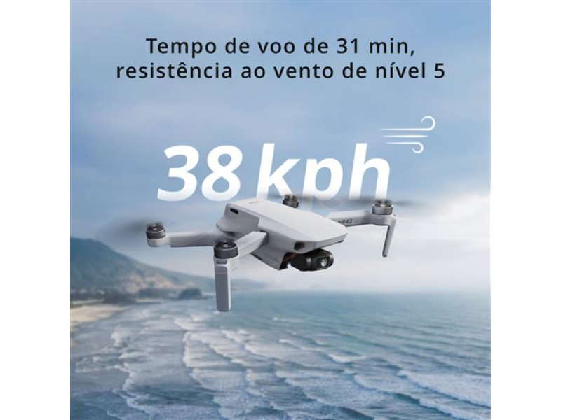 Com uma bateria de 2250 mAh, o DJI Mini 2 SE permite um impressionante tempo de voo de até 31 minutos, o que é suficiente para voar, escolher o local perfeito e captar a imagem ideal. Este drone consegue resistir a ventos de Nível 5 e voar até uma altitude de 4000 metros, garantindo imagens estáveis mesmo em condições desafiadoras.