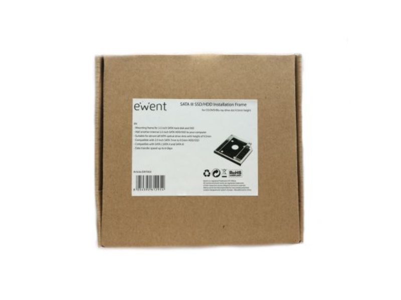 A estrutura corresponde a uma altura de 9,5 mm e foi projetada para SSDs e HDDs SATA de 2,5 polegadas. A estrutura de montagem Ewent EW7003 para SSD/HDD, para o slot de unidade de CD/DVD/Blu-ray, é usada em quase todos os compartimentos de unidade óptica com interface SATA. Ela permite a expansão de memória por meio do uso de um disco rígido/SSD e permite acesso mais rápido aos dados contidos nela.