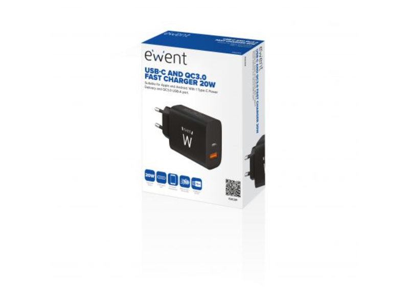 > Carregador de parede EWENT EW1319 com 20W de potência, ideal para carregamento rápido. Possui porta USB, compatível com vários dispositivos e garante um desempenho fiável.