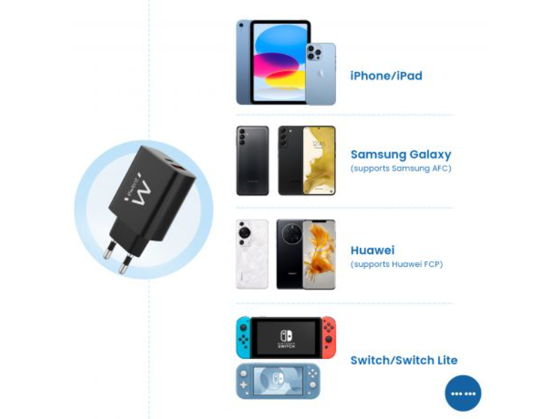 Use o EW1319 USB-C e QC3.0 Fast Charger 20W para carregar o seu smartphone/tablet Android com Power Delivery e suporte QC 3.0. O carregador USB negoceia com o seu smartphone/tablet para encontrar o perfil de carregamento adequado.