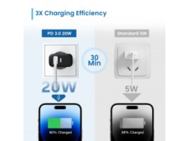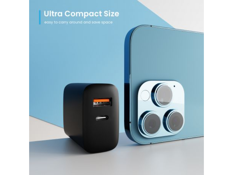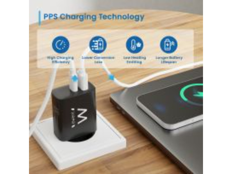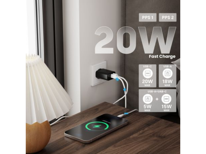 20W USB-C + QC3.0 Charger tem um PPS (Programmable Power Source) que é um padrão que se refere à tecnologia avançada de carregamento para dispositivos USB-C. Ele pode modificar a tensão e a corrente em tempo real, alimentando a potência máxima com base no status de carregamento de um dispositivo. A principal vantagem do PPS em relação a outros padrões é a sua capacidade de reduzir a perda de conversão durante o carregamento. Isso significa que menos calor é gerado, o que aumenta a vida útil da bateria do dispositivo.