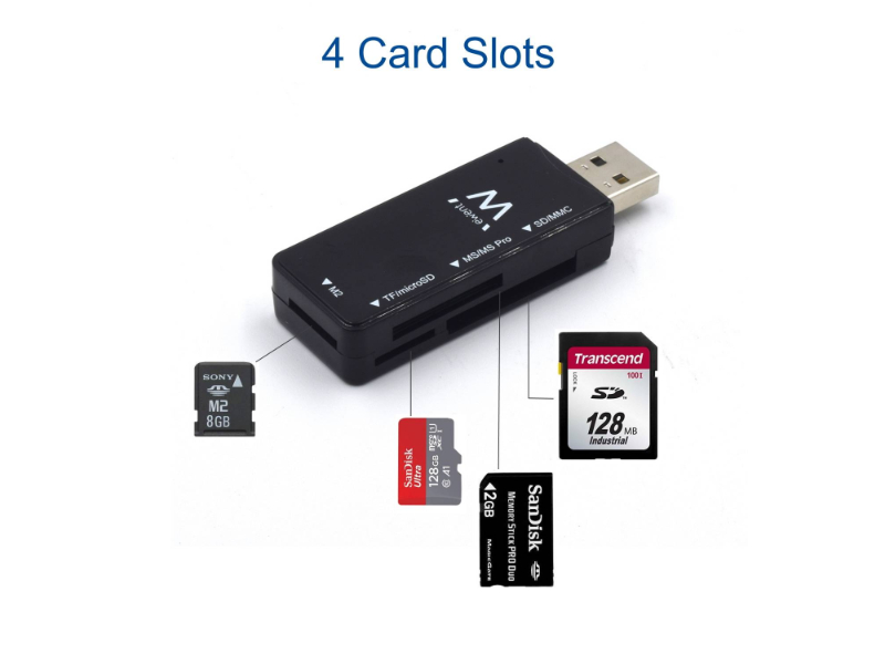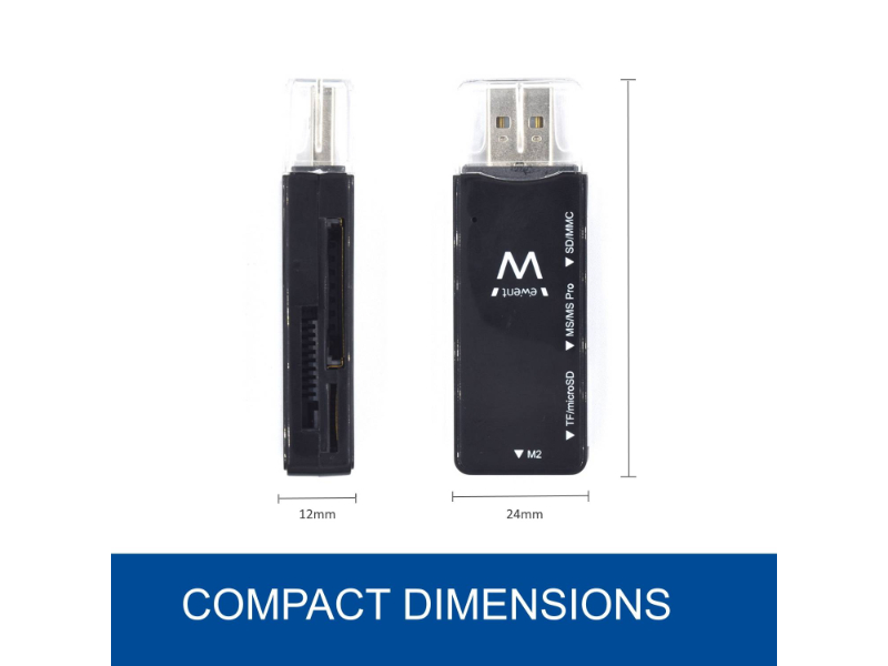 Os cartões de memória mais utilizados são suportados pelo Leitor de cartões USB 2.0 Multi porta Ewent: T-Flash(Micro SD) / SD/ MMC/RS-MMC/ MS/ MS Pro/ M2/ MS DUO.