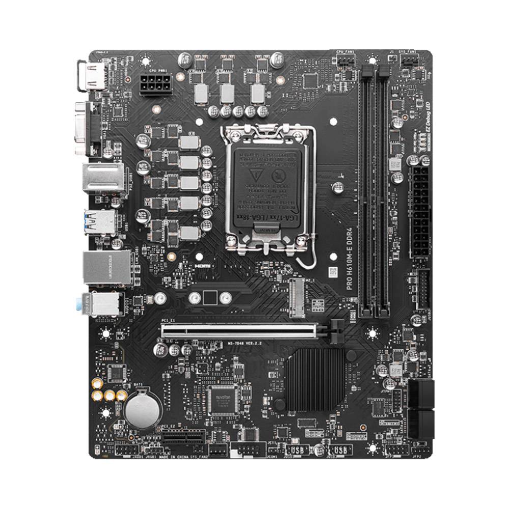 > Motherboard Micro-ATX MSI Pro H610M-E DDR4 | é uma escolha sólida para construir um sistema confiável e eficiente. Com suporte para processadores Intel da 12ª geração e memória DDR4, oferece desempenho estável para uma variedade de tarefas. Seu formato compacto Micro-ATX é ideal para gabinetes menores, enquanto recursos como slots PCIe Gen4 e USB 3.2 garantem conectividade rápida e de última geração. Com uma combinação de qualidade MSI e recursos essenciais para construção de PC, a H610M-E DDR4 proporciona uma base sólida para usuários que buscam uma plataforma confiável e acessível.