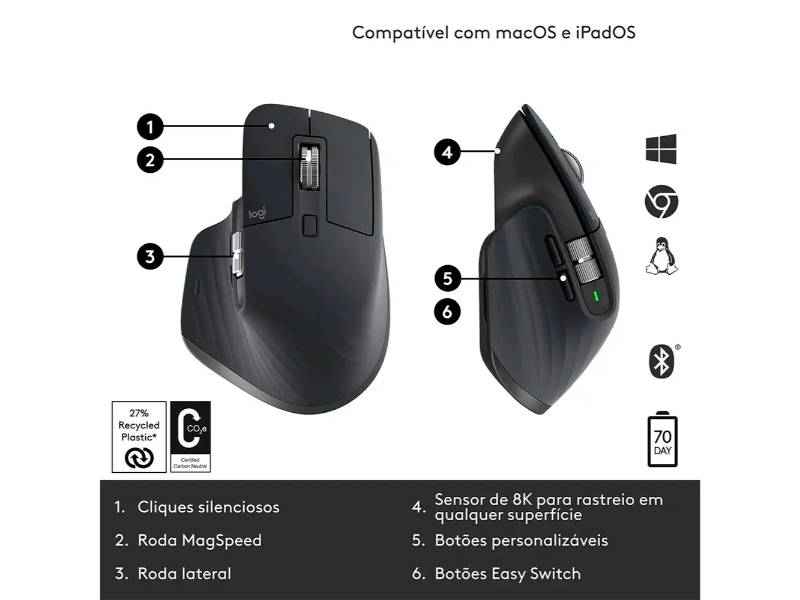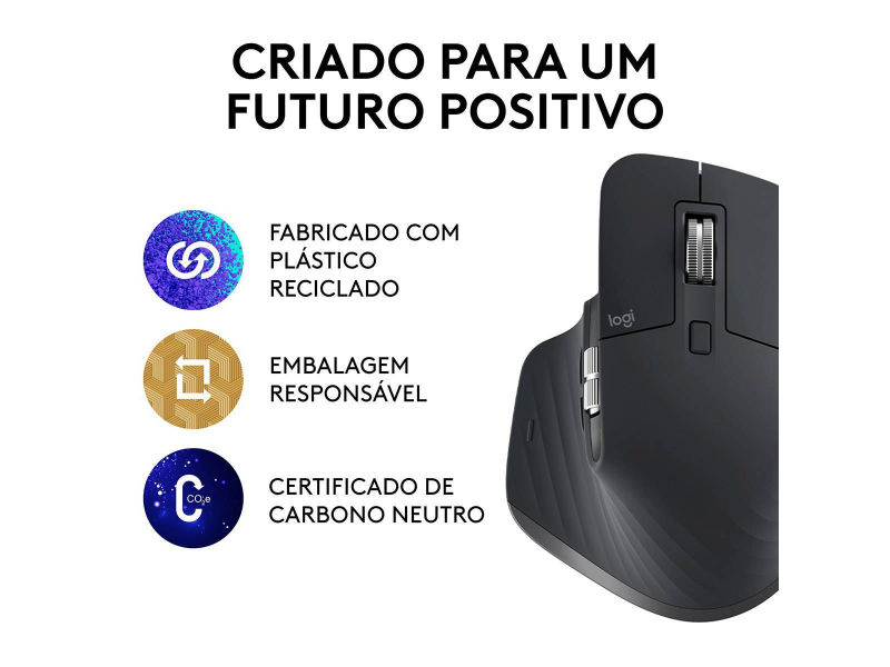 As partes de plástico no MX Master 3S incluem plástico pós-consumo reciclado com certificação (Grafite e Preto: 27%, Pale Gray: 22%*. Certificado de carbono neutro.