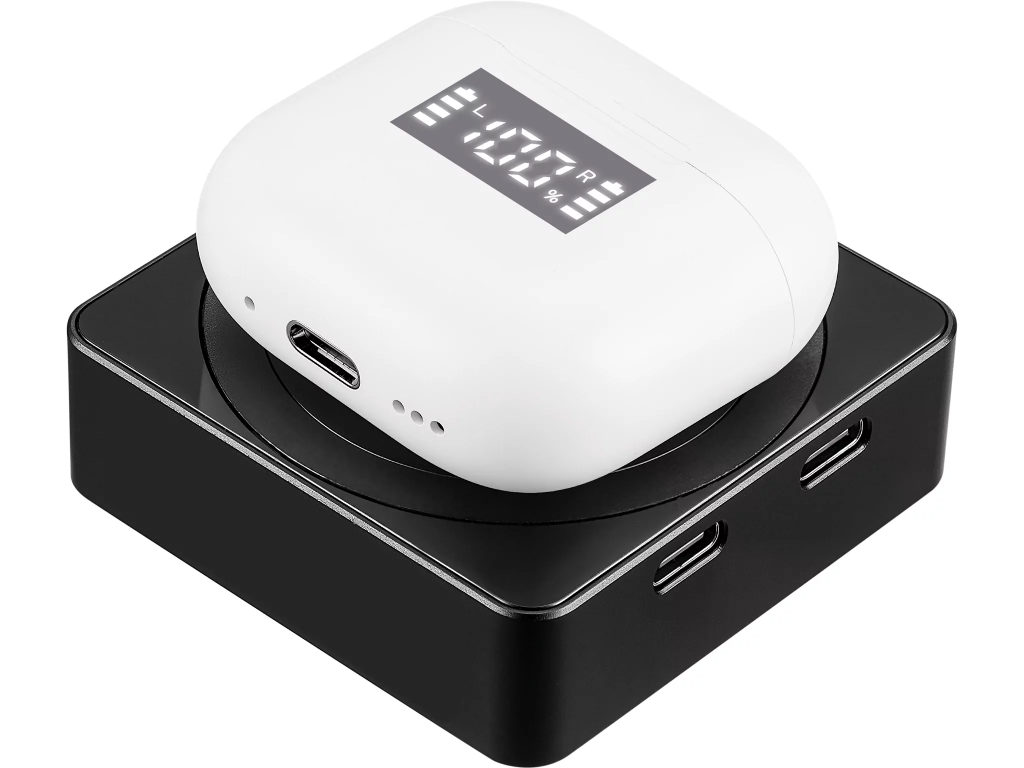 Além do carregamento sem fios, o Sandberg 3in1 5000 tem duas portas USB-C que suportam tanto entrada como saída com Power Delivery. A saída total máxima das duas portas é de 20 W, com perfis de 5 V/3 A, 9 V/2,22 A e 12 V/1,67 A, adequados para carregamento rápido de iPhones, AirPods e outros dispositivos USB-C. A entrada total máxima é de 18 W via qualquer das duas portas USB-C, com perfis de 5 V/3 A, 9 V/2 A e 12 V/1,5 A, permitindo a recarga da própria powerbank com um carregador USB-C PD adequado em tempo razoável. A disponibilidade de duas portas USB-C permite carregar dois dispositivos com cabo em simultâneo, ou usar uma porta para recarregar a powerbank enquanto a outra alimenta um dispositivo.