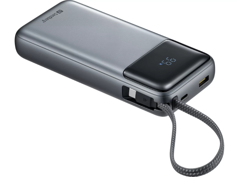 > Para viajantes e utilizadores que querem carregar laptop, tablet e smartphone a partir de um único powerbank compacto sem depender de cabos extras, o Sandberg All-in-1 Powerbank 20000 PD 67W oferece 74Wh em polímero de lítio, cabo USB-C integrado com saída até 67W, porto USB-C adicional 67W, USB-A 22,5W, ecrã de estado de carga e pass-through. 403g, aprovado para voos.