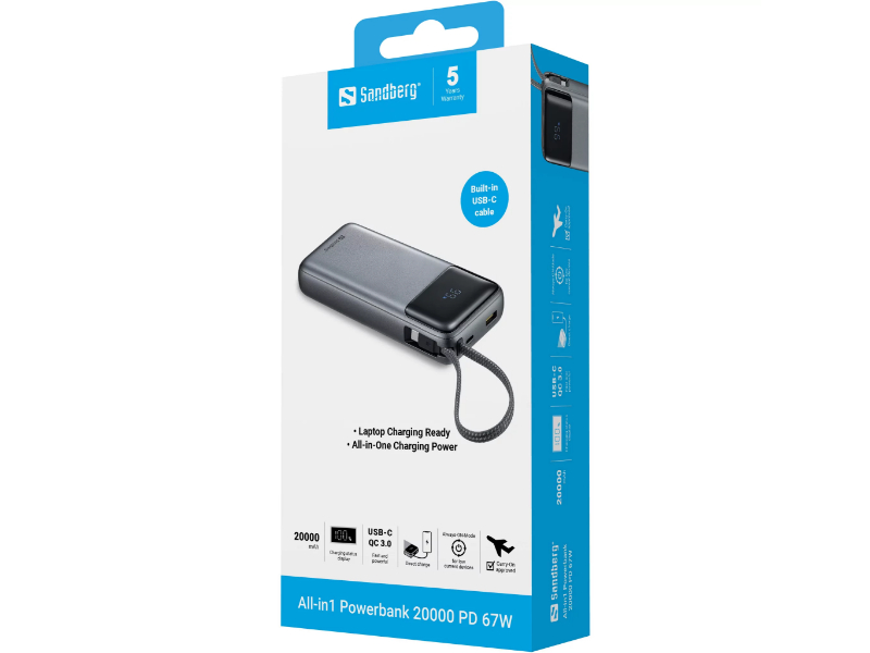 Powerbank Sandberg All-in-1 20000mAh PD 67W: Cabo USB-C Integrado, 74Wh, Ecrã e Aprovado para Voos