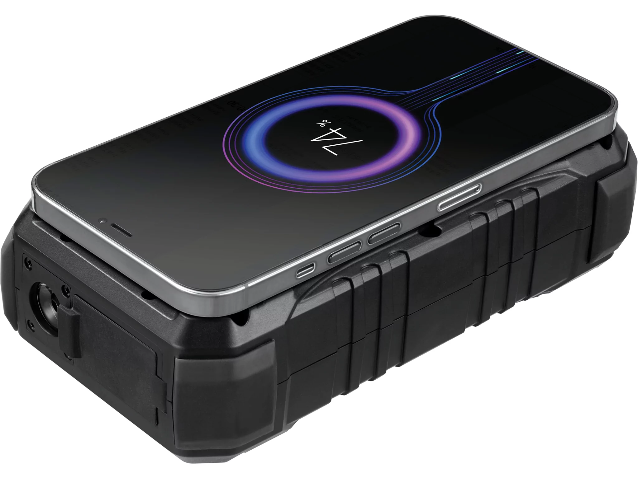 O carregamento sem fios até 15W carrega smartphones Qi sem cabos, simplesmente pousando o dispositivo sobre o powerbank. Os dois portos USB-A entregam cada um até 18W com suporte a Quick Charge 3.0, cobrindo o carregamento rápido de smartphones Android e outros dispositivos compatíveis. A saída DC5525 de 12V/2A permite alimentar equipamento de 12V como pequenas bombas de ar, iluminação DC ou outros acessórios de camping e outdoor que não têm conector USB.