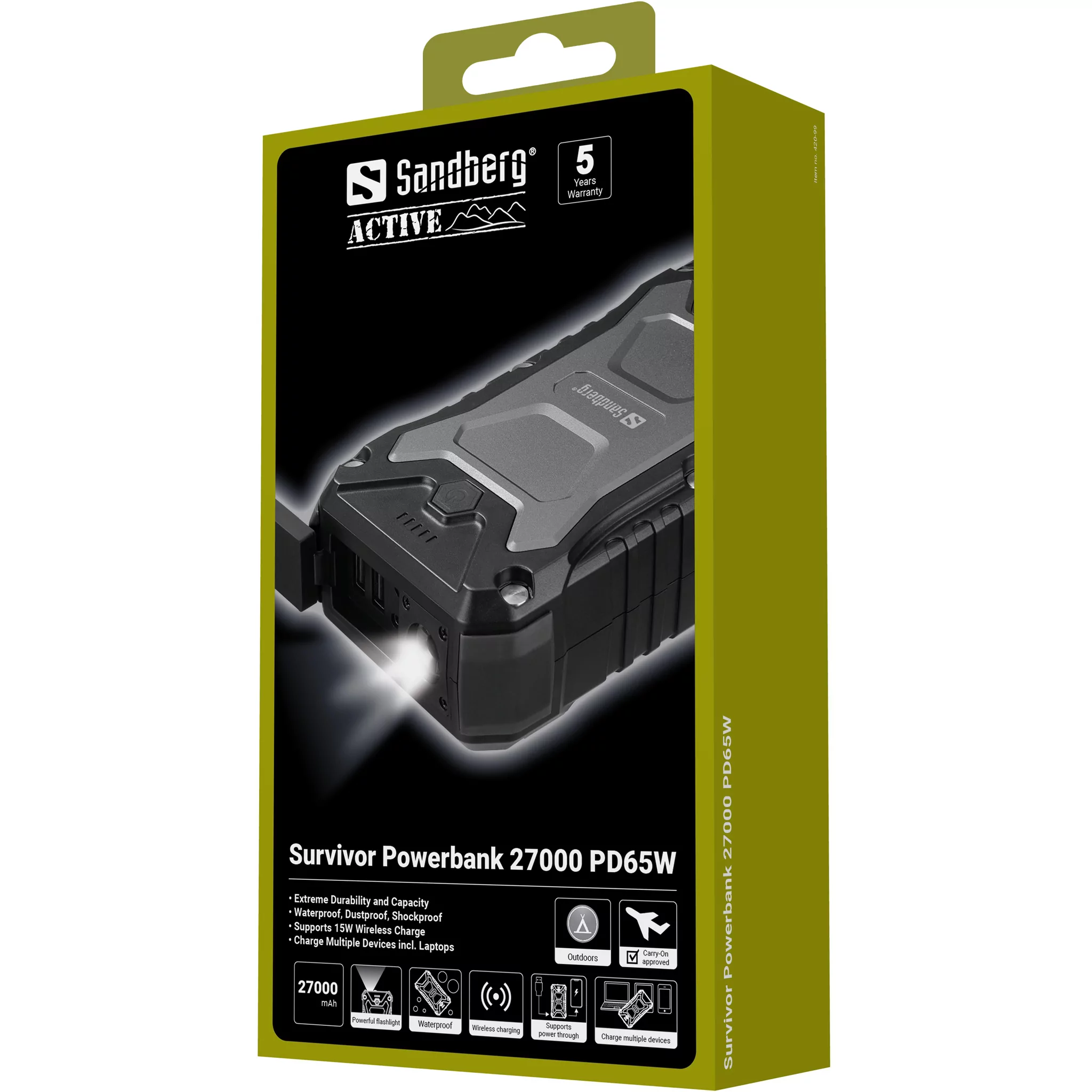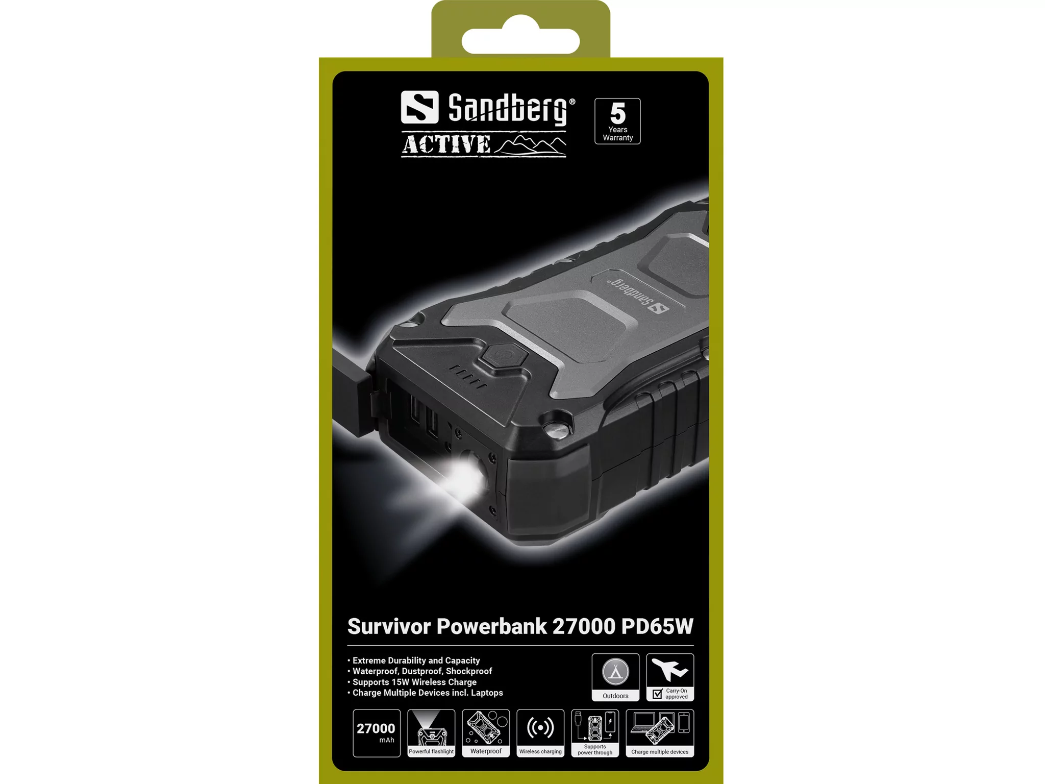 > Para quem precisa de um powerbank de alta capacidade que aguente as condições mais adversas, o Sandberg Survivor 27000 PD65W oferece 99,9Wh em carcaça IP66 à prova de água, poeira e impacto, USB-C PD 65W para laptops, carregamento sem fios 15W, dois USB-A 18W, saída DC 12V, lanterna LED de 120 lúmens e mosquetão incluído. Premiado pela Nikktech com Golden Award. Capacidade máxima permitida em avião.