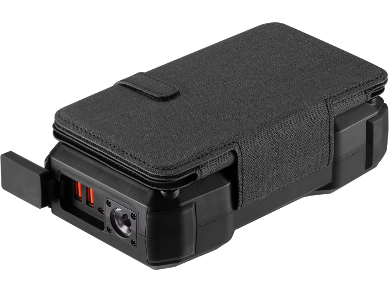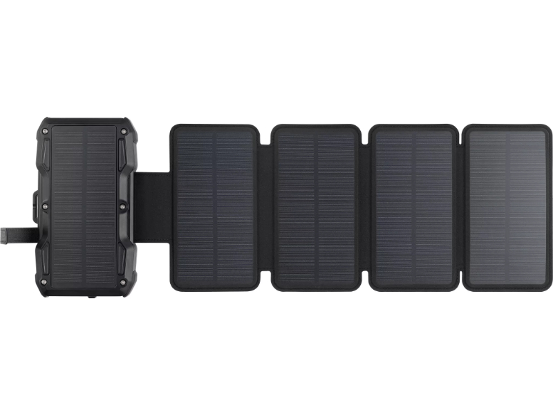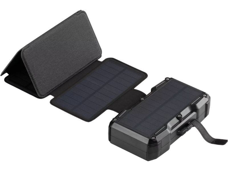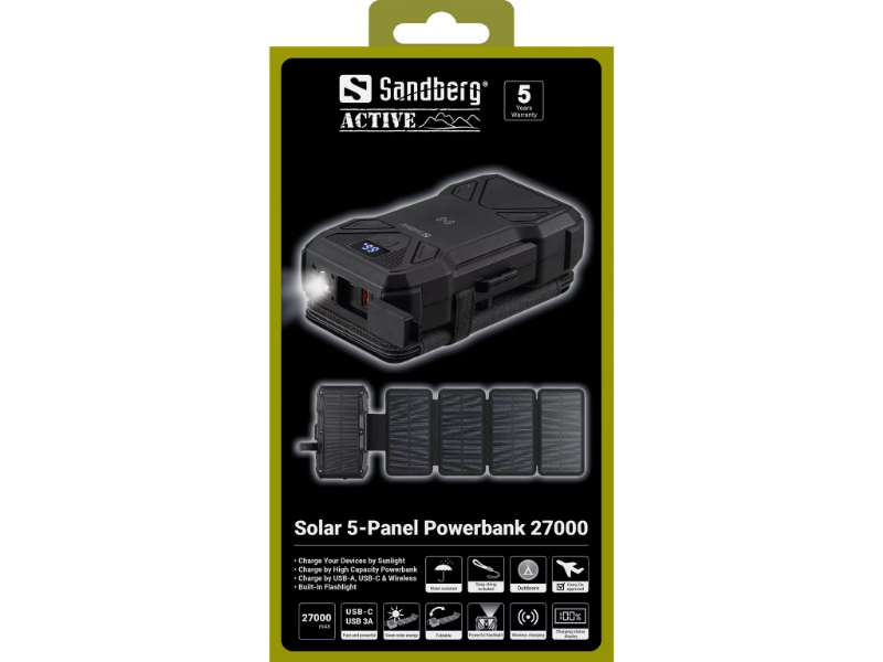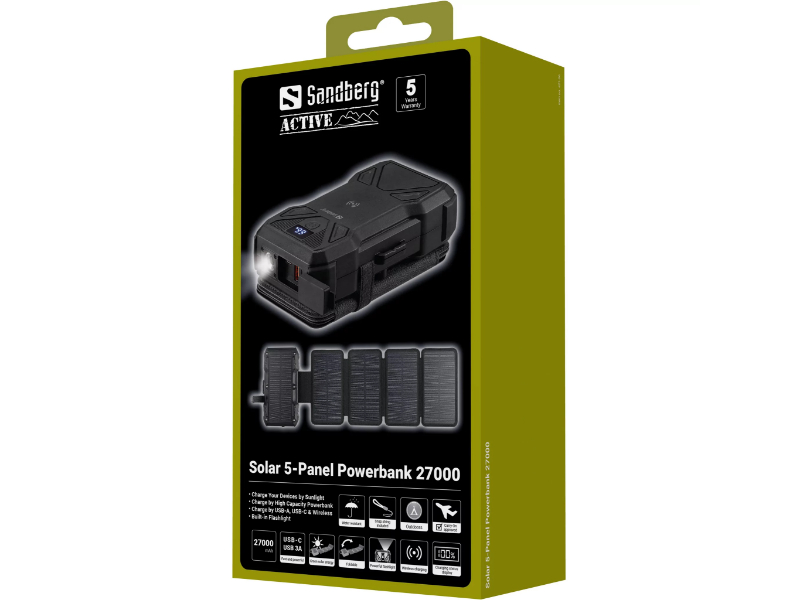 A FAZ Kaufkompas descreveu-o de forma precisa: do tamanho de um smartphone moderno quando dobrado, com uma superfície solar cinco vezes maior quando desdobrado. O Sandberg Solar 5-Panel Powerbank 27000 parte de uma capacidade de 99,9Wh — o máximo permitido em cabine de avião — e acrescenta quatro painéis solares dobráveis que expandem para uma superfície de captação de 8W sob luz solar directa. A lógica de uso é simples e eficaz: carregar o powerbank em casa antes de sair, e aproveitar qualquer exposição solar disponível ao longo do dia para acumular energia adicional. Preso à mochila durante uma caminhada, pousado numa mesa num festival ou colocado numa janela ensolarada durante uma viagem de carro, o painel solar vai adicionando autonomia continuamente. A Time for Metal recomendou-o sem reservas para qualquer pessoa que procure um powerbank, destacando a solidez da construção, o peso de 900g que não incomoda em caminhadas e a garantia de 5 anos.