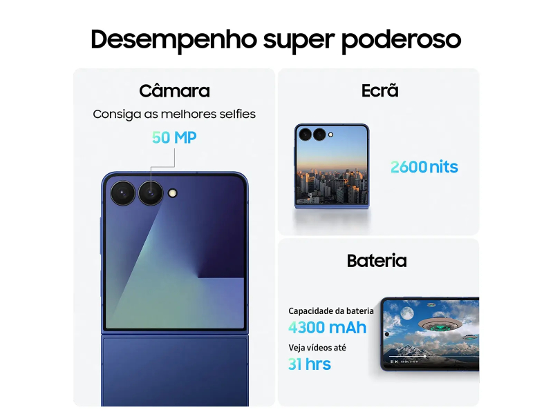 O ecrã exterior redesenhado do Galaxy Z Flip7 apresenta a nossa moldura mais fina de sempre, permitindo-te fazer mais a partir do ecrã exterior do que nunca. O impressionante ecrã principal apresenta agora uma experiência de visualização sem interrupções.