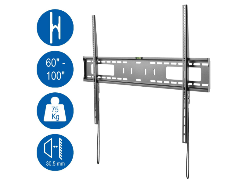 O suporte de parede para TV fixo resistente EW1504 XXL é a solução ideal para montar a sua TV (60 polegadas até 100 polegadas, peso máximo de 75 kg) extremamente próxima à parede. O suporte tem um perfil fino de 30.5 mm e é adequado para todas as TVs com padrão de montagem VESA. O sistema de segurança mantém a TV firmemente no lugar.